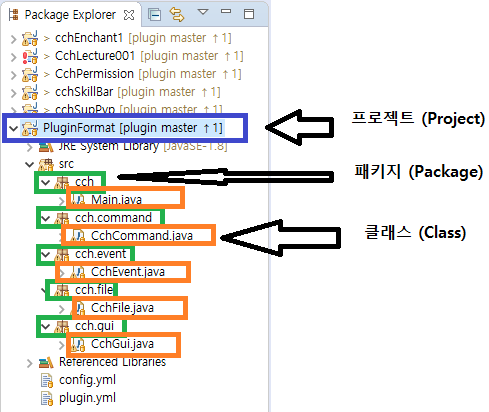 패키지 : java에서는 보통 기능별로 package를 나눕니다. 사람마다 기준이 다르겠지만 저는 command, event, file, gui 정도로 나누었고 패키지 분리하는 방법에 대해서는 차후에 설명해드리겠습니다.
