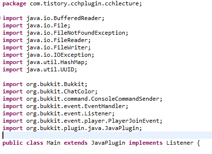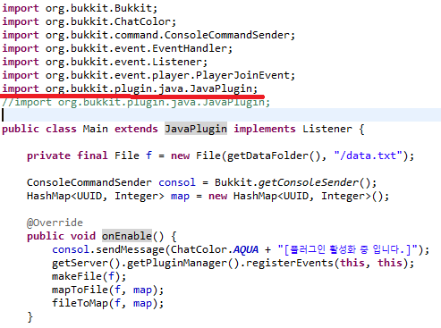 아래와 같이 org.bukkit.plugin.java.JavaPlugin라는 Class 경로를 가진 것을 import 내용을 주석으로 사용하면,