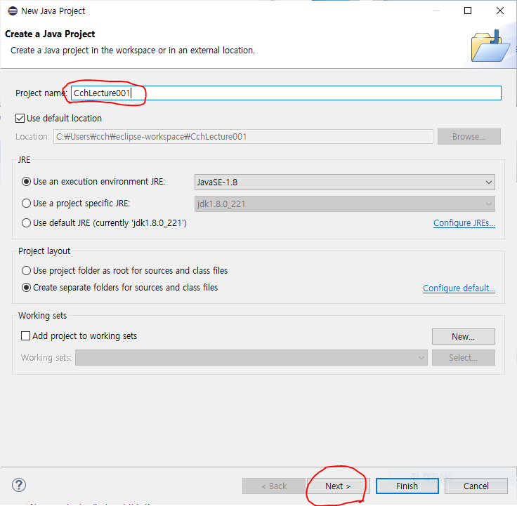이클립스를 킨 후 사진을 참고하여 프로젝트를 생성해주세요.