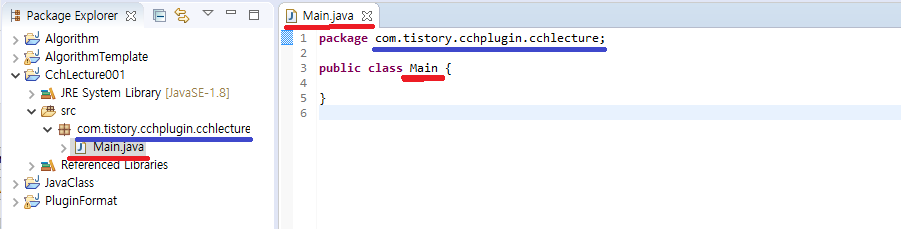 파란색 부분이 패키지 이름, 빨간색 부분이 클래스 이름입니다. 잠시 후 사용될 예정이니 위치를 잘 기억해두세요!