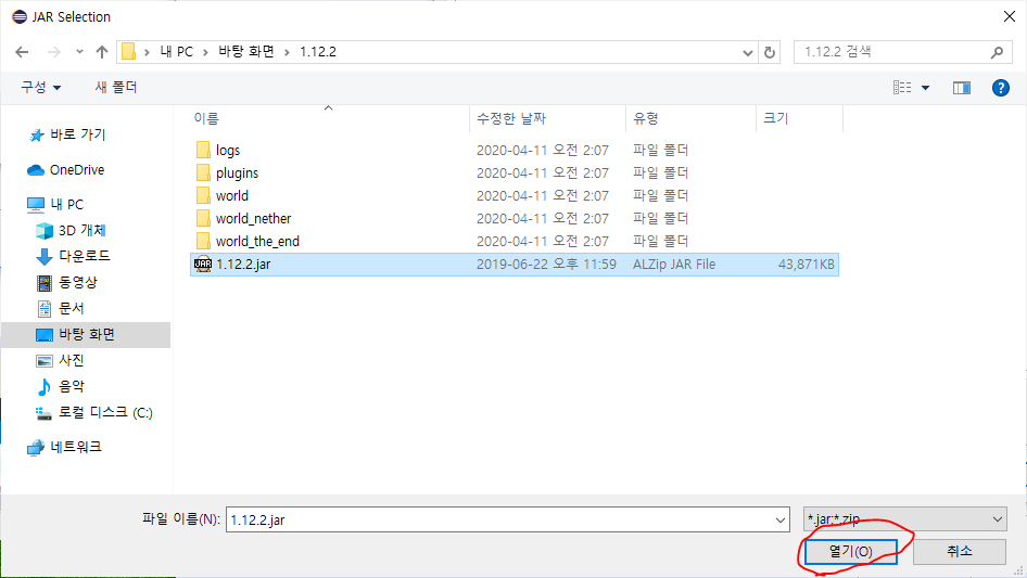 마인크래프트 서버 구동기가 있는 파일에서 .jar 파일을 찾아서 등록하면 됩니다.
