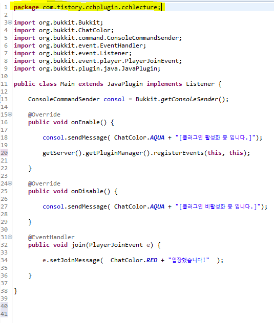 public void join(PlayerJoinEvent e) { // 플레이어가 입장할때 실행되는 부분입니다.